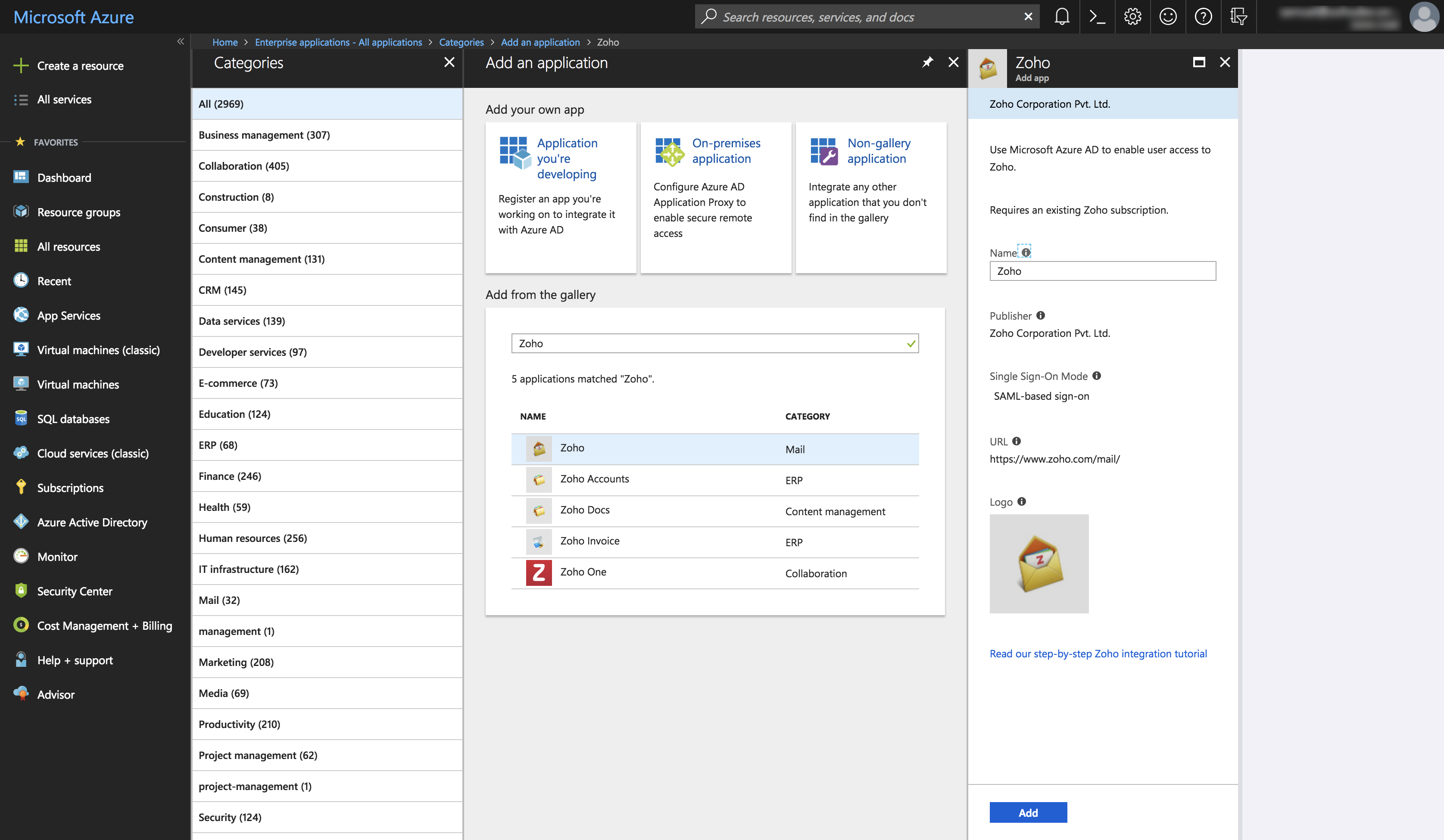 - 在 Add from the Gallery(从库中添加)选项卡下键入 'Zoho'。