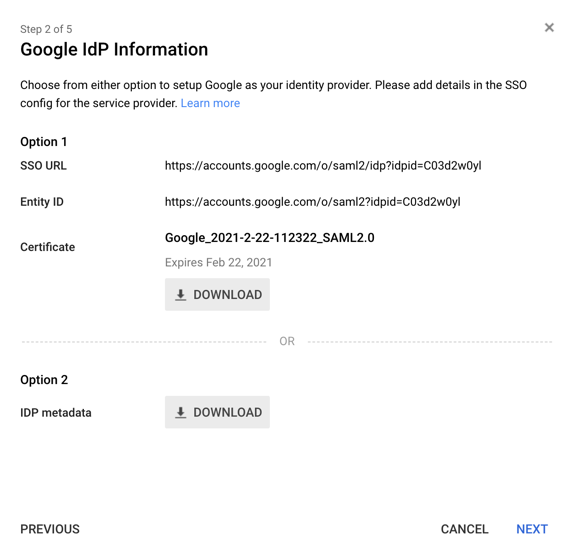 Google IdP 信息窗口将打开,并且 Single Sign-On URL(单点登录 URL)字段值和 Entity ID URL's(实体 ID URL)将可见。 - 复制“Entity ID(实体 ID)”和“Single Sign-On URL(单点登录 URL)”字段值,然后下载 X.509 Certificate(X.509 证书)。