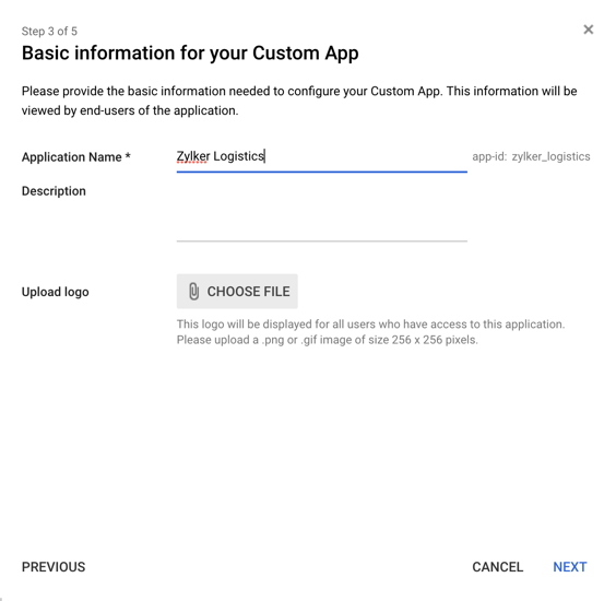 - 在 Basic Application Information(基本应用信息)窗口中输入您的 Application Name(应用名称)。您可以选择输入 description(说明)并选择上传徽标。