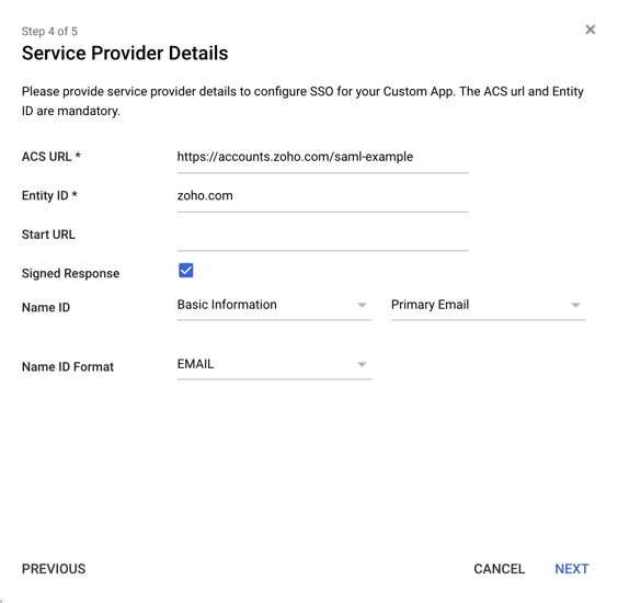 - 在“Service Provider Details(服务提供者详细信息)”窗口中,添加 ACS URL、实体 ID 和启动 URL。