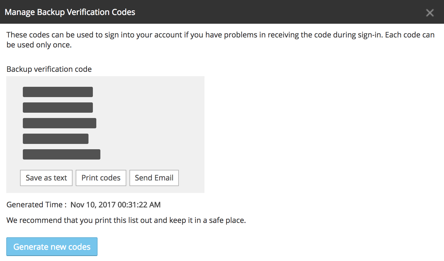 如果要重新生成备用代码,请单击 Generate new codes(生成新代码),这将删除现有代码并生成一组新的备用代码。