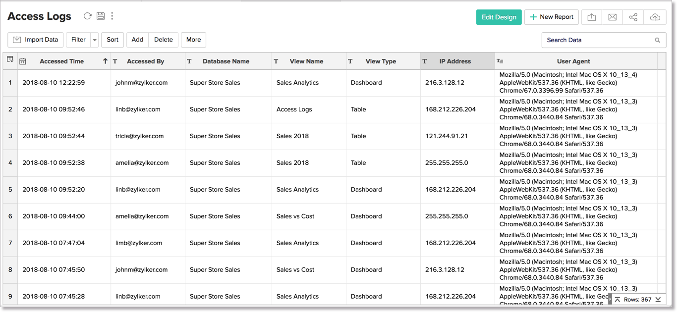 Zoho Analytics 允许您通过审计日志跟踪您帐户中所有用户(从管理员到公共用户)的活动。