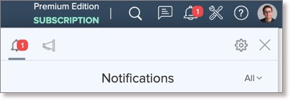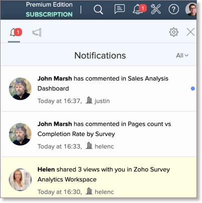 您可通过单击 Zoho Analytics 帐户右上角的通知图标来访问通知消息流。