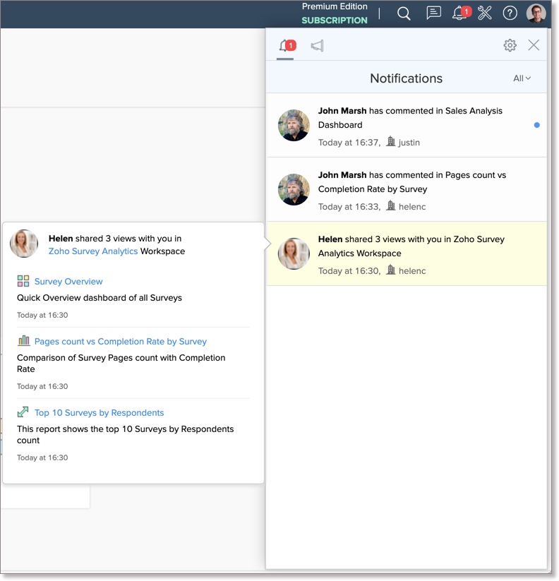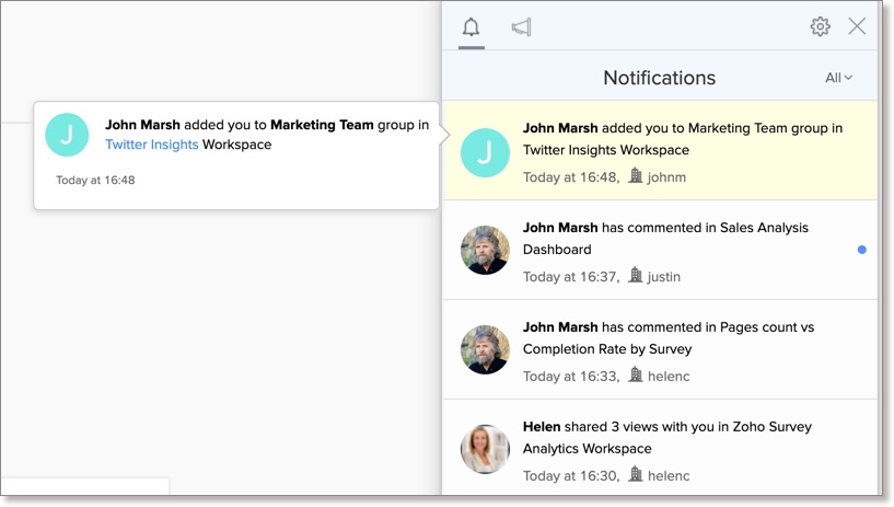 您 Zoho Analytics 帐户中的通知消息流将在帐户中发生任何新活动时立即通知您。它还将让您从通知消息流本身访问相关信息。