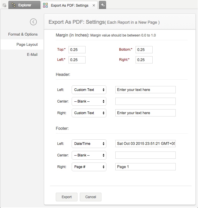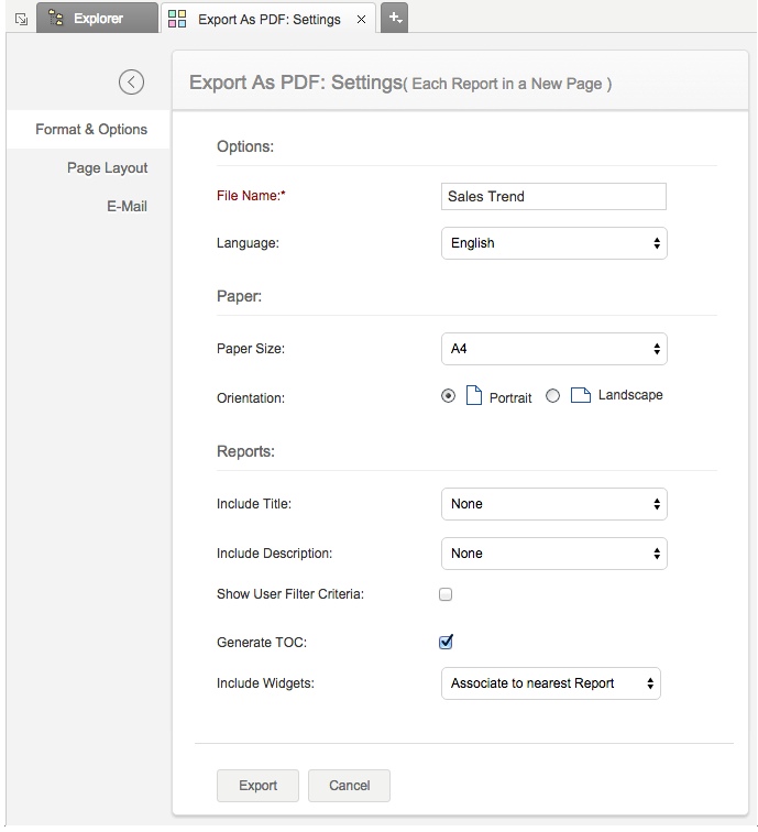- 单击导出图标,然后选择导出为 PDF > 每个报表另起一页。