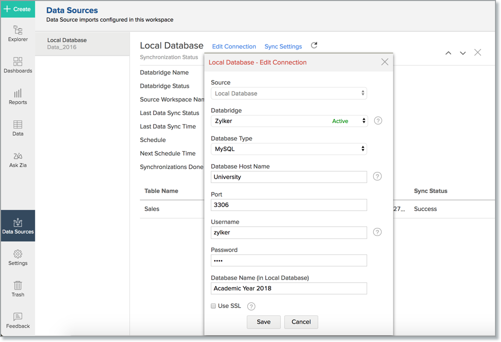- 单击保存。您的 MySQL 数据库的数据将按设置的间隔导入 Zoho Analytics。