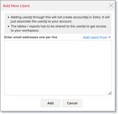 - 在出现的添加新用户对话框中,您可以通过从您的 Zoho/Google Contacts 中选择用户或通过输入用户来添加用户。