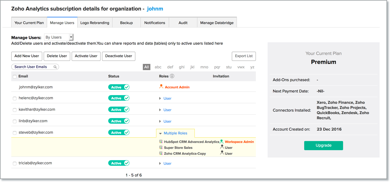 - 默认情况下,从管理用户页面或通过共享报表添加至帐户的所有新用户将设置为活动状态,且将计入 Zoho Analytics 帐户用户限制。