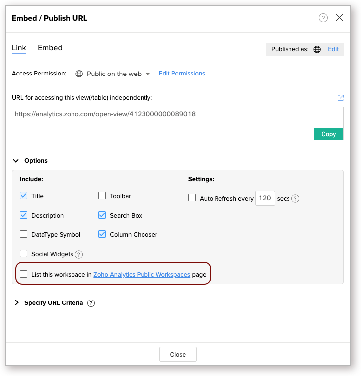 是的,您可以通过单击 在 Zoho Analytics 公共工作区中列出此工作区页面,在 Zoho Analytics 公共工作区页面中列出已发布的工作区。