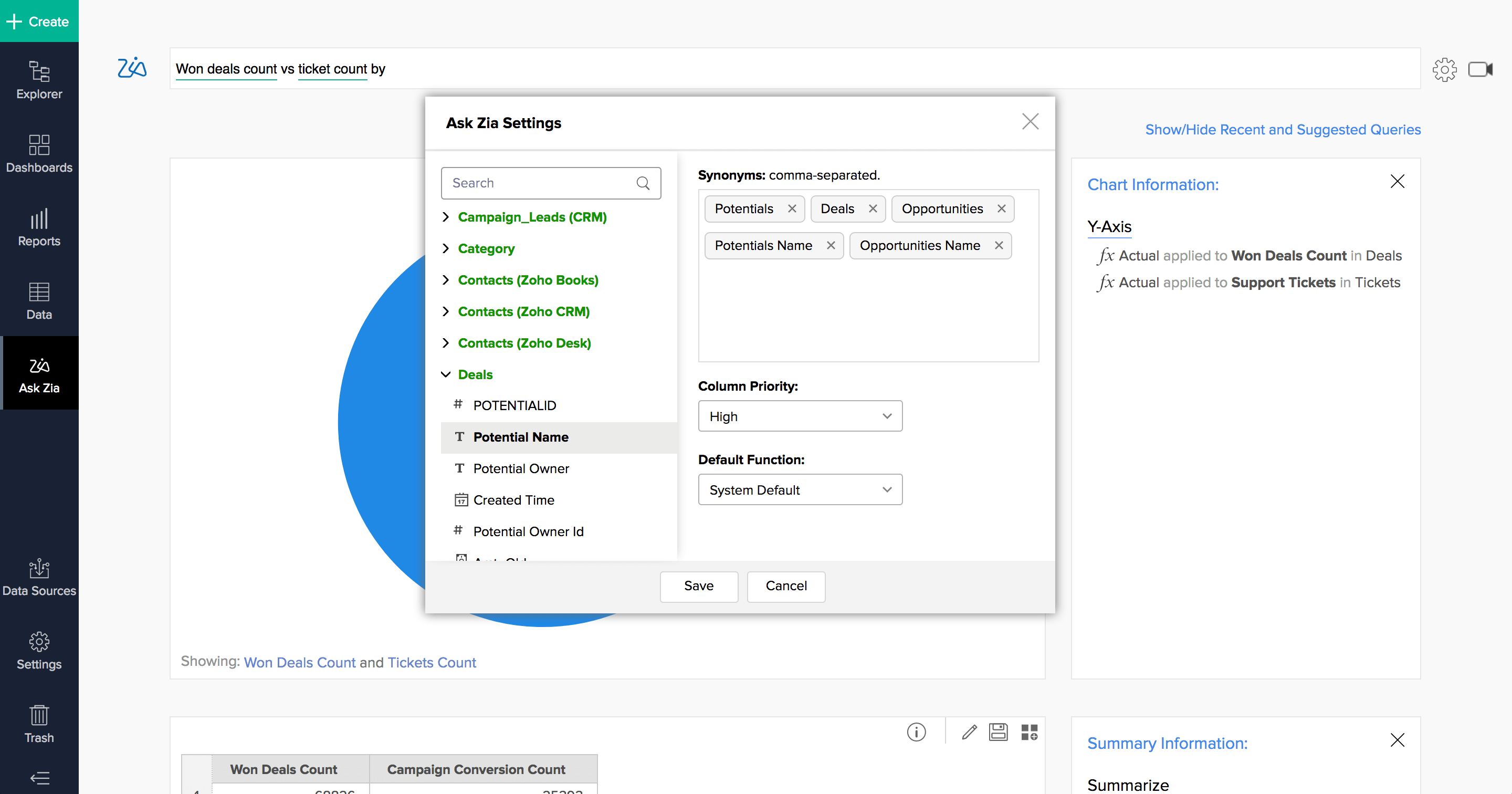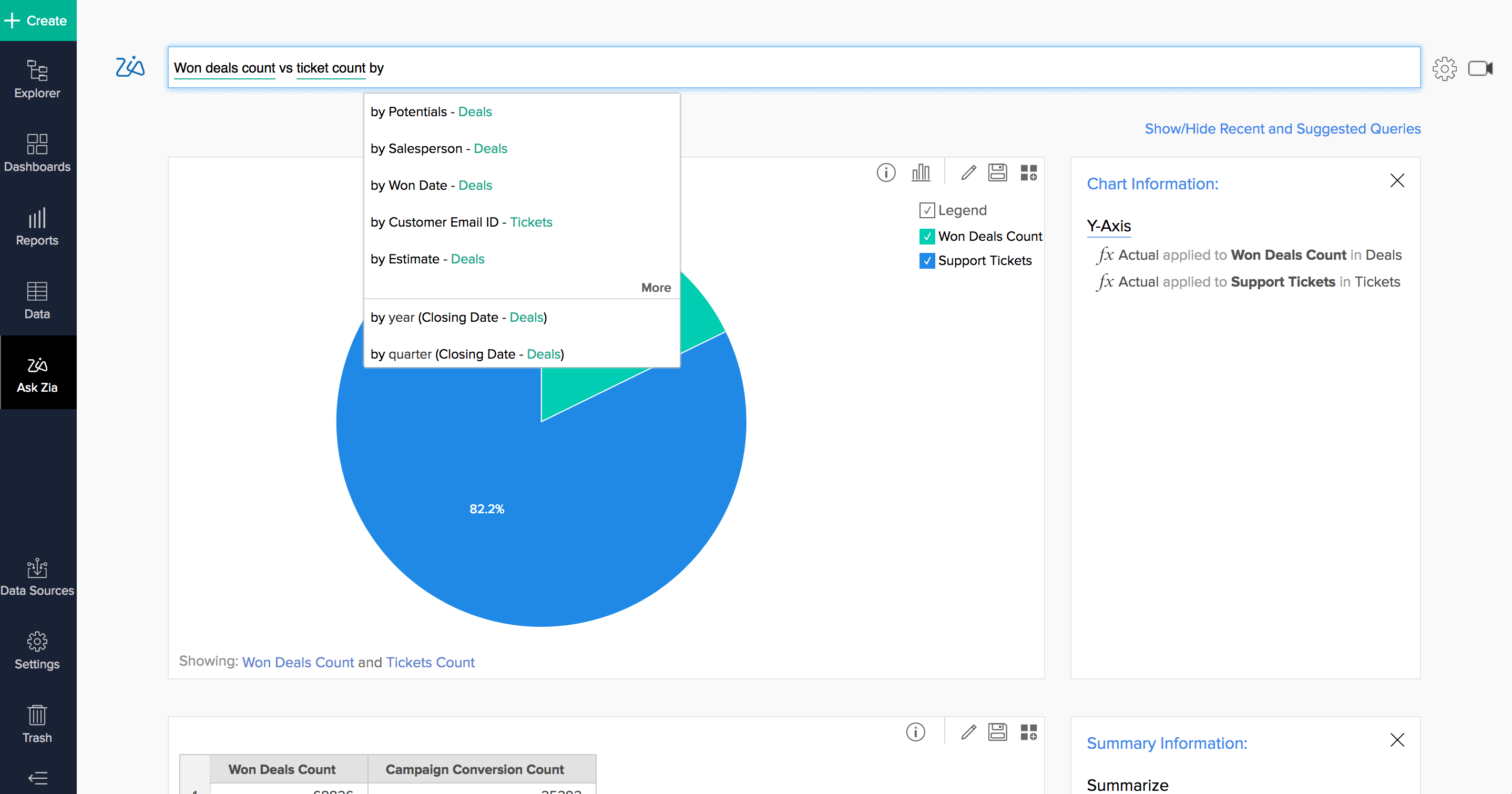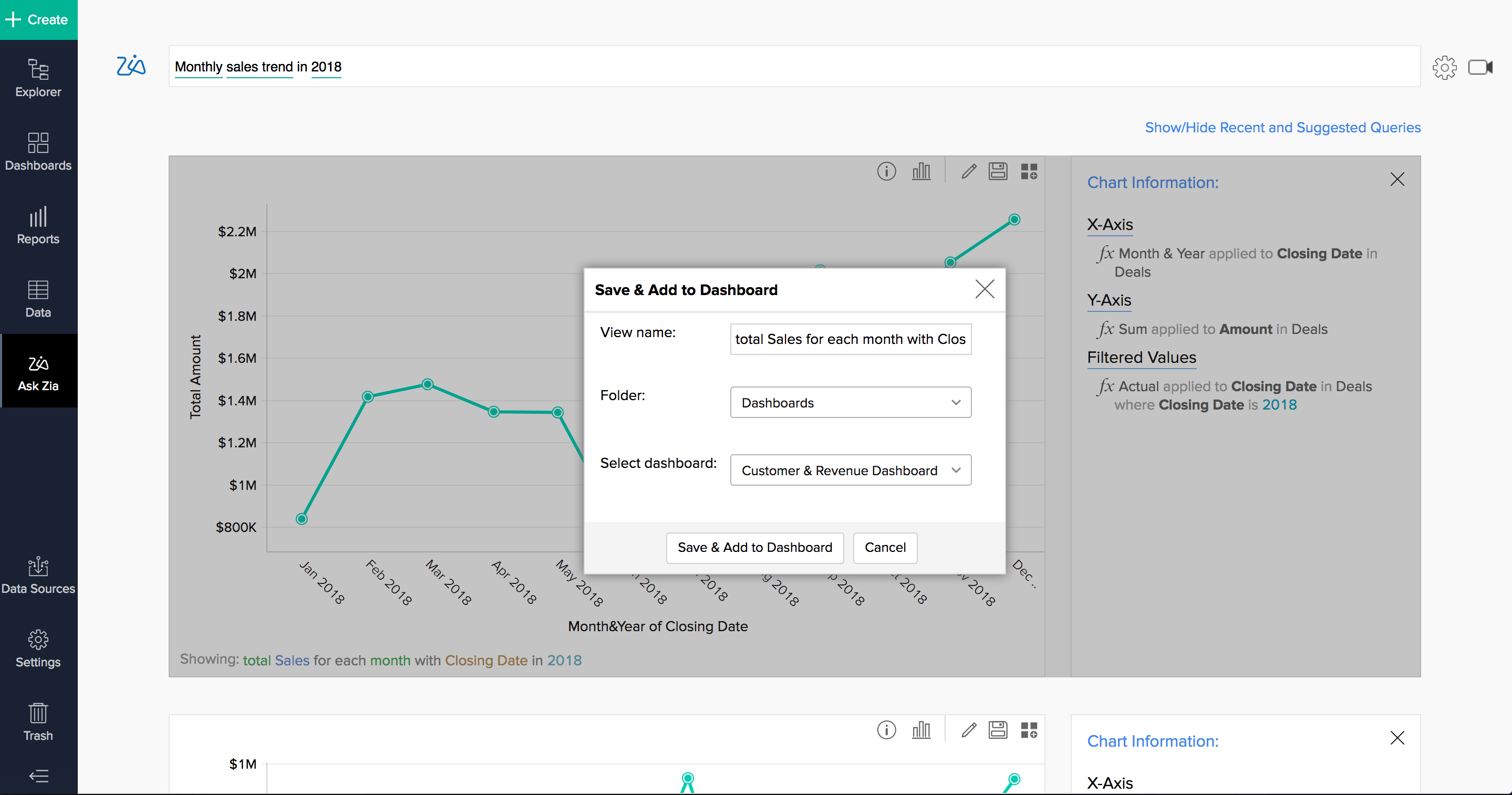 Zia 对您的数据有着深入的了解,可以为您提供明智的建议,帮助您提出正确的问题。轻松缩小搜索范围,让 Zia 为您构建可视化效果。