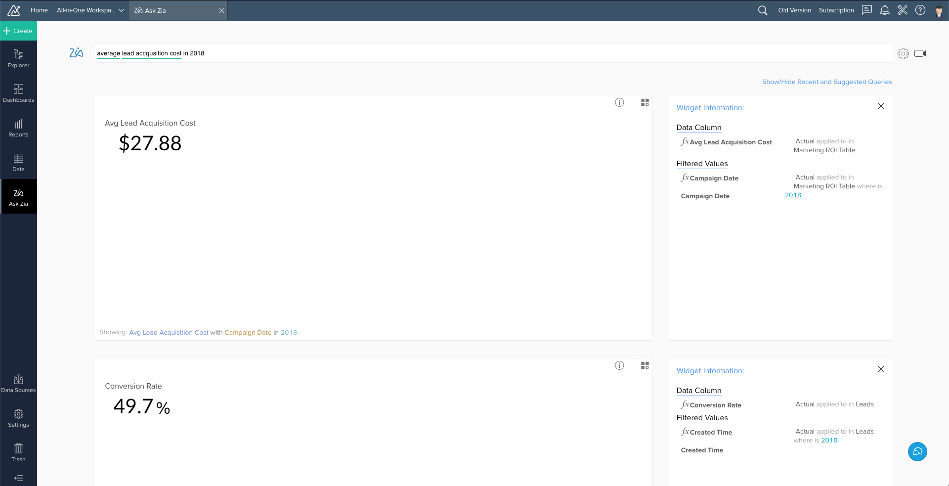 在人工智能分析助理 Zia 的帮助下,您可以在几秒钟内分析和获得见解。Zia 使用机器学习和自然语言处理来了解您的数据,即时构建功能强大的报表和仪表板。