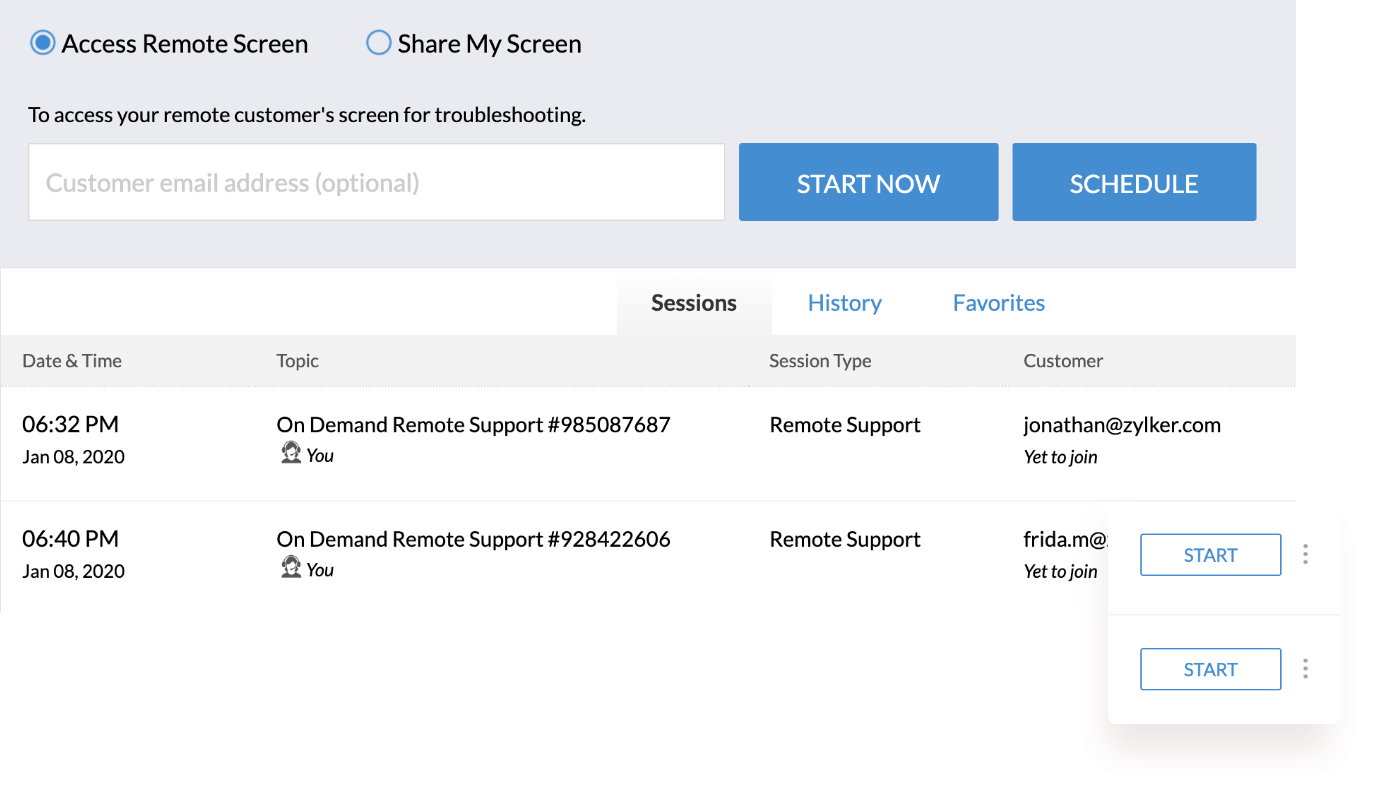您可以启动即时按需远程支持会话,单击立即开始,或单击安排在其他时间进行会话。启动远程支持会话后,您可以通过三种方式邀请远程人员。您可以发送短信或电子邮件邀请,让客户导航到 join.zoho.com 以加入会话,或者您可以通过您选择的聊天工具向他们发送加入链接。