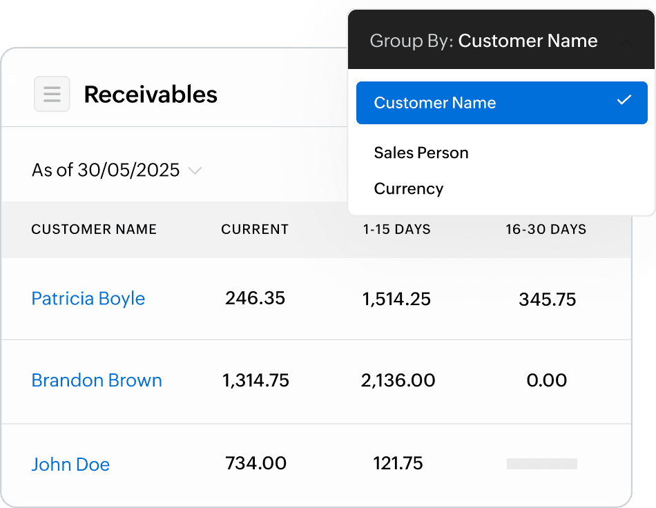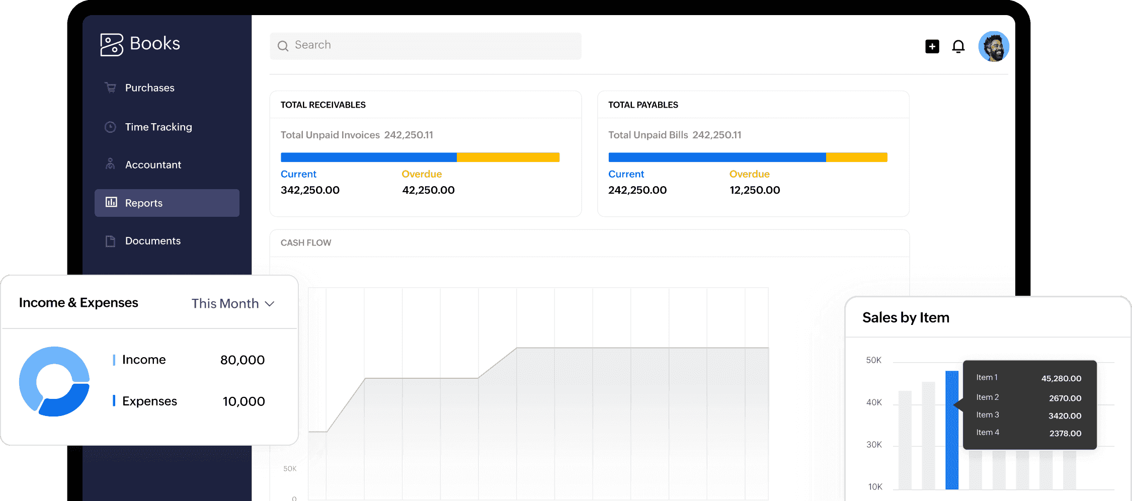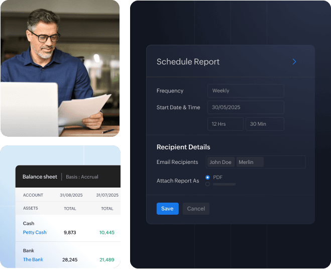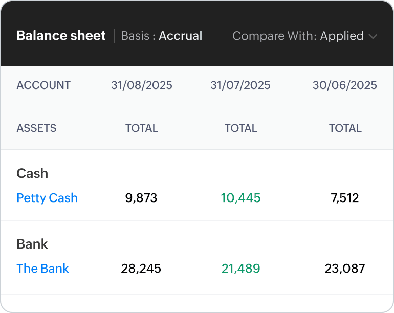 业务全景一目了然:通过Zoho Books智能仪表盘快速掌握现金流、应收应付、税务负债等关键财务指标,实时呈现企业运营态势。