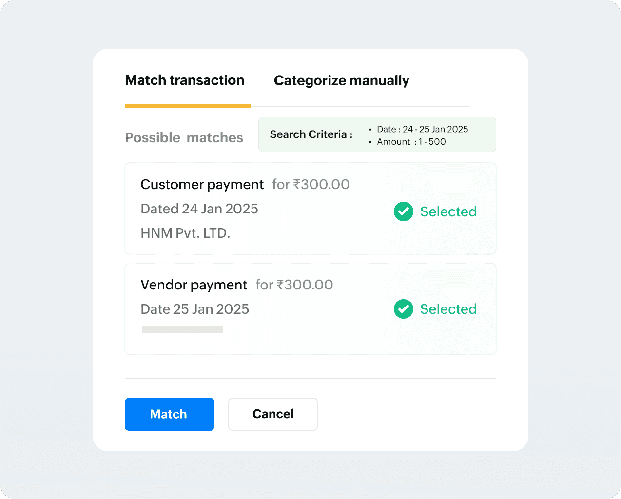银行模块的智能算法会立即为您从Zoho Books交易中获取每个银行对账单的“最佳匹配”和其他“可能匹配”,为您节省宝贵的时间