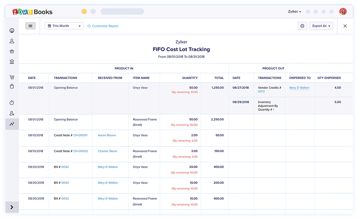 随时查看您的库存及其当前估值。Zoho Books会使用FIFO方法评估您的库存。