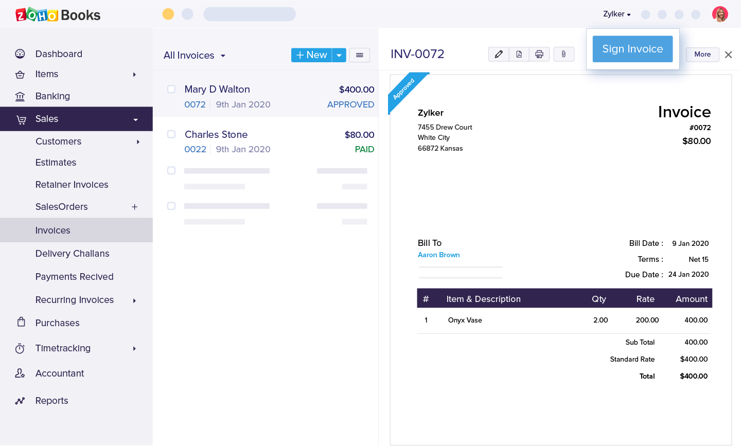 使用您的数字签名来防止伪造或篡改形式发票 Invoice。我们的Zoho Sign集成基于高级别的安全性,符合ESIGN和eIDAS电子签名法律。