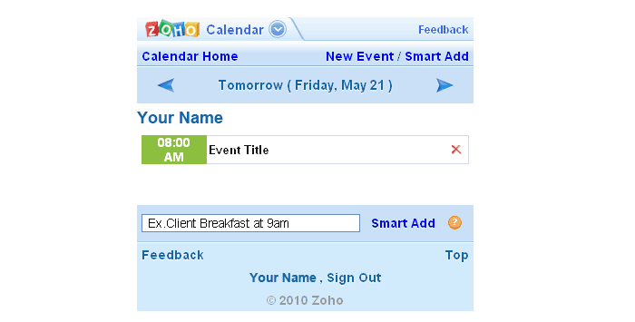 We enable you to access your calendars even on your mobile phones. Use a Mobile Web Browser on iphone, android, blackberry, windows phone and nokia smart phones to access Zoho services. You can view your calendars in, both Day and Month views, and add new events as well. Smart Add feature too is supported on mobile. Are you having a different mobile from the ones mentioned above? You may still try accessing our mobile website which would work fine. Should you run into any issues, you can let us know details about your device. Write to us at support@zohomobile.com.
