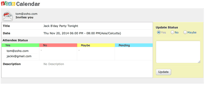 Non-Zoho users can view, update and track RSVP using the web URL provided in the email.