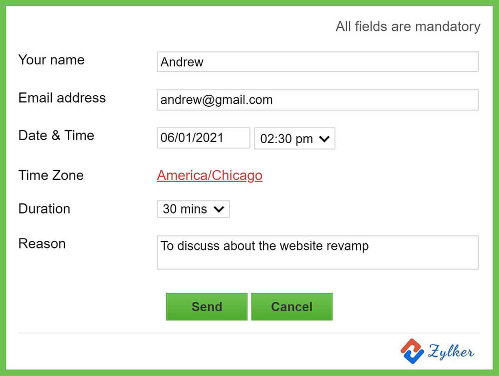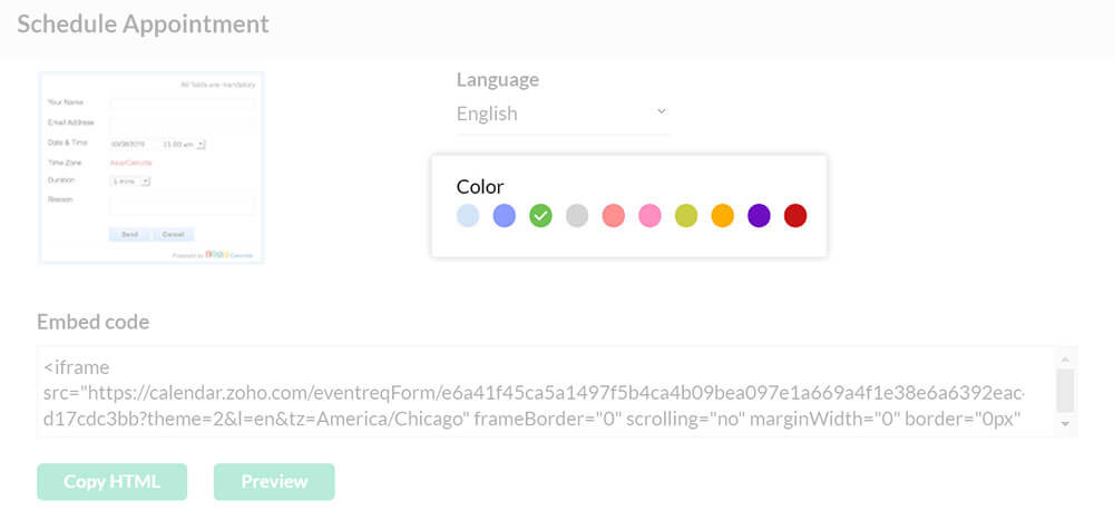 分享您的忙闲状态,彻底避免重叠的预约。将 Zoho Calendar 嵌入到您的网站中,让访客得知您何时有空接受预约。