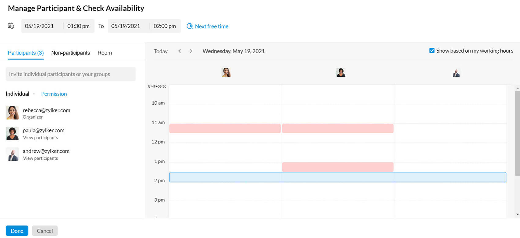 主持活动并通过电子邮件邀请贵机构以外各种不同平台的用户。借助 Zoho 的会议排程工具,您可以为日历网格设置辅助时区,并与全球各地的团队在线安排活动。