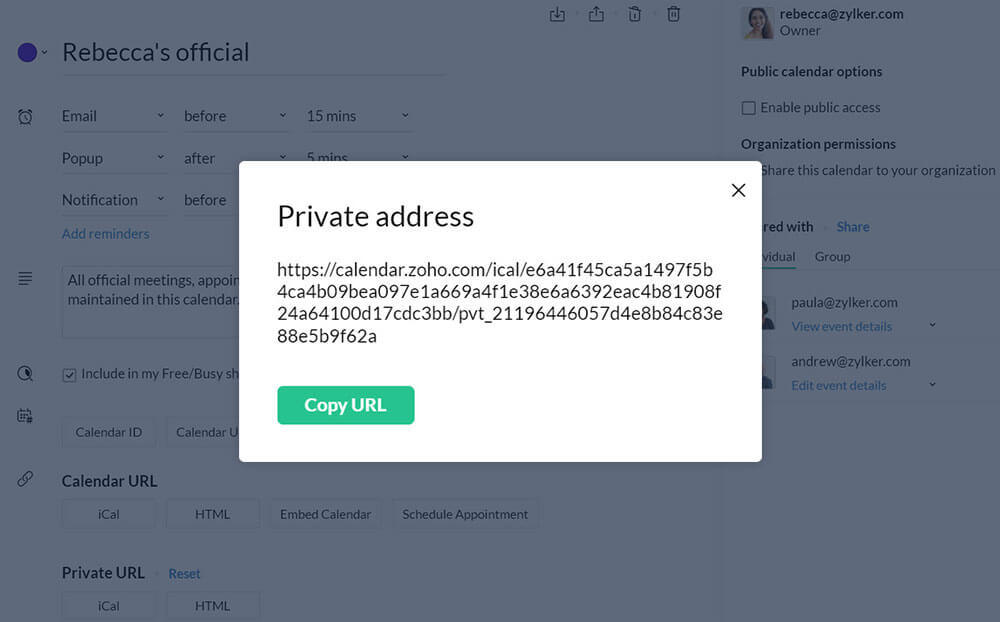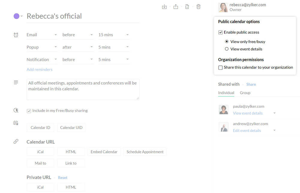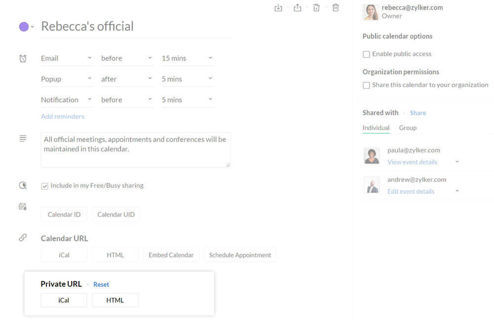 无论其他用户使用哪个平台,您都可以授权他们查看您的日历详细信息。使用 iCal URL 和 HTML URL,您可以与使用不同平台的人员共享日历,让他们了解您的新动态。