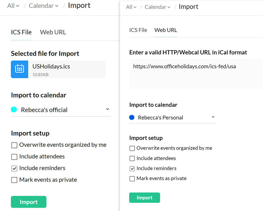 将其他日历中的活动添加到 Zoho Calendar 轻而易举。只需以文件的形式导入日历,或者添加日历的 URL。完成后,您将收到有关所有日历上列出的活动的通知。