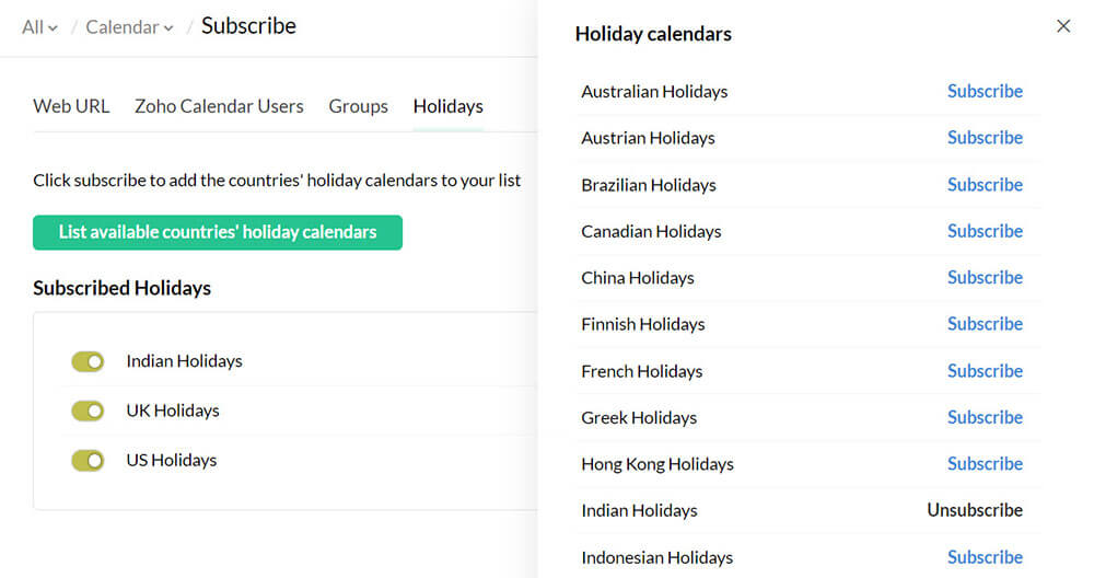 订阅任意多个节假日日历,随时了解您所在国家/地区的节假日。