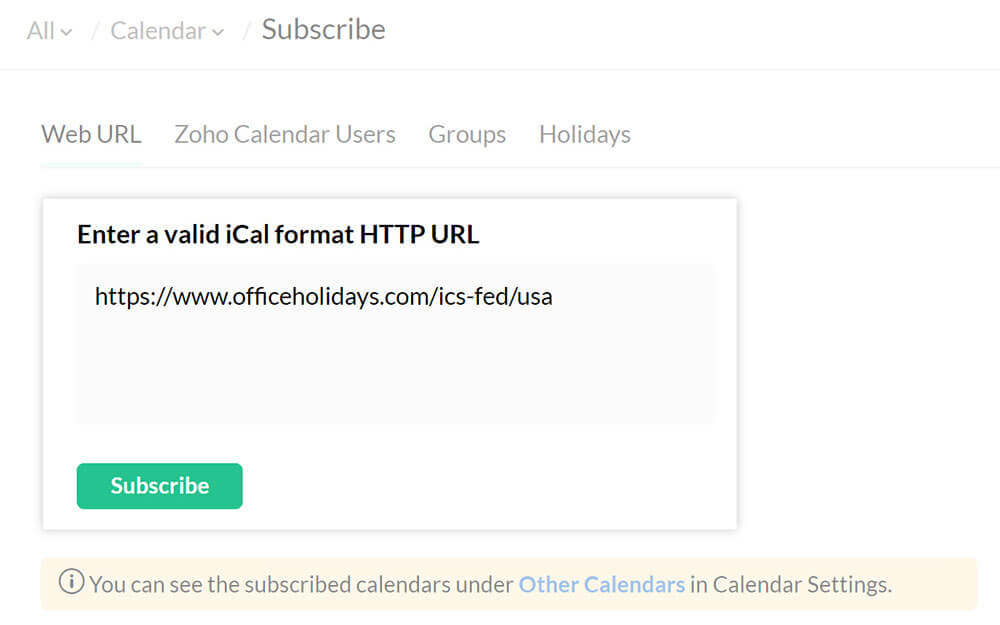发现了一个公共日历,想要将其融入您自己的日程表?只需选择该日历的 URL,然后将其添加到 Zoho Calendar 中。