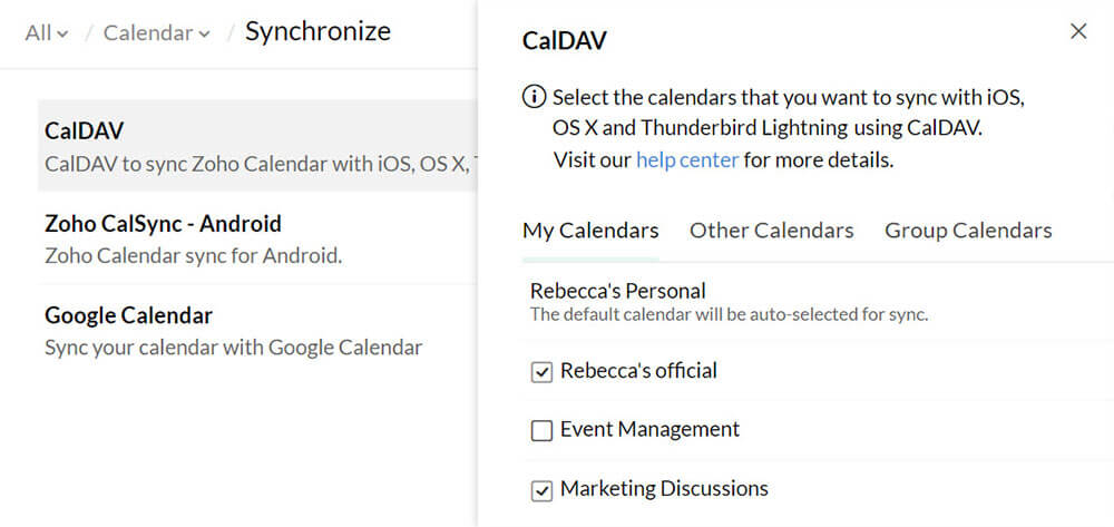 使用 CalDAV 同步,您可以将 Zoho Calendar 与 MacBook、iPhone、iPad、Thunderbird Lightning 和 eM 客户端帐户同步。