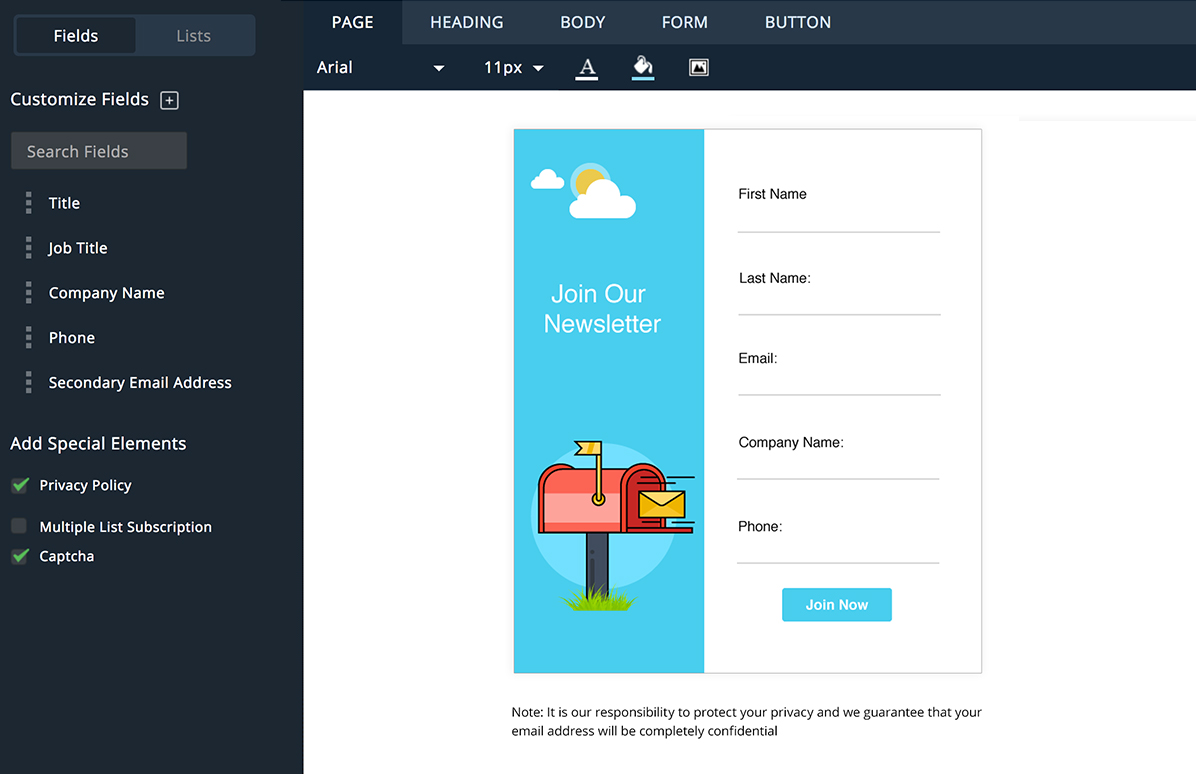 Zoho Campaigns 提供了各种各样的注册表单模板。选择与您的网站相匹配的注册表单模板、添加您需要的字段,吸引更多的访客来注册,订阅。