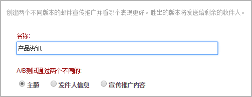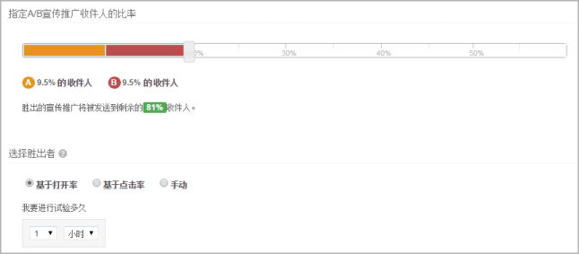 指定A/B宣传推广收件人的比率: 从列表中选择您想要发送A/B宣传推广的联系人百分比。