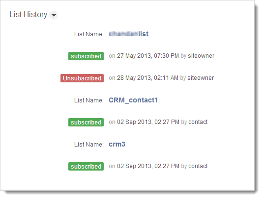 You can view the past of contacts such as number of lists associated with the contact, the number of times subscribed and unsubscribed from a list, and by whom (site owner or subscriber) the contact was subscribed. To view contact history, follow the steps below: