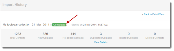 Import Details - This will give a detailed history about the total contacts, new contacts, duplicated contacts, ignored contacts and deleted contacts.