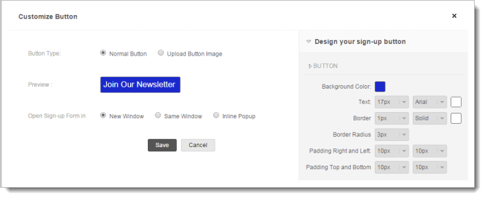 You can create a sign-up button by customizing it with different font style, color or upload your own button image. You can customize the sign-up button by selecting the button type, background color, border, font style, etc.