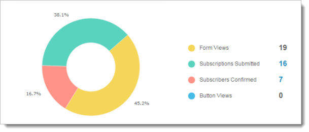 You can view the number of visitors who have viewed the sign-up form and the subscribers who have submitted and confirmed their subscription. The data is represented in the form of numerical data and a doughnut chart to explain the following: