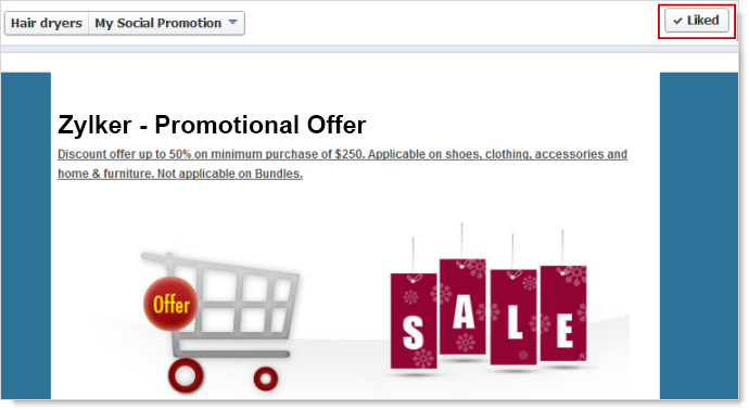 The developers at Zoho Campaigns put their heads together to develop a marketing feature that revolved around the ‘Like’ feature. To break it down, what happens when a first time visitor lands on a tab in your Facebook page is that they see one particular promotional banner like the one given below. You could create your banner with an exciting offer or you can simply prompt the visitor to ‘Like’ the page to avail an exclusive benefit. There is no end to how creatively you can use this space. That said this feature works best when you prompt the visitor to perform a particular action and then reward them for it.