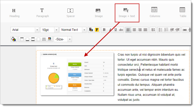Using this component, you can add images and text in the same section of the template editor.