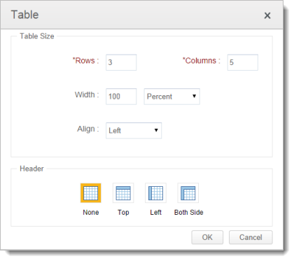 | Table properties - This property allows to customize the number of rows, columns, width, alignment and header of a table. |