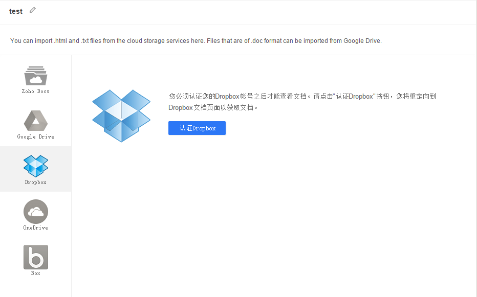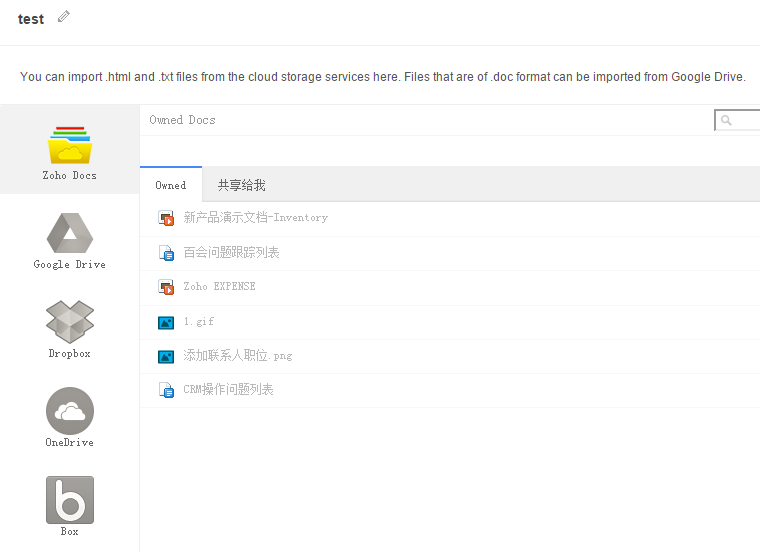 - 从 Zoho Docs中选择您的HTML或txt文件并点击导入按钮