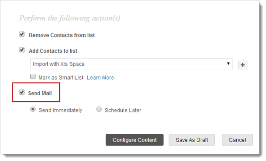 - Send Mail - An automated email is triggered to contacts meeting the defined conditions. All you need is to add the content for the email and schedule it immediately or at a later time. Once the content is reviewed, you can activate the workflow process from its detail view page.