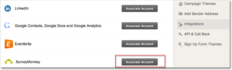 - In Integration page, Click the Associate Account related to SurveyMonkey option.