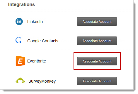 - In Integration page, Click the Associate Account related to Eventbrite option.