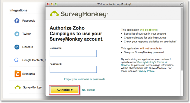 - You’ll get a popup message with Authorize option. Enter your SurveyMonkey Credentials and click Authorize to proceed.