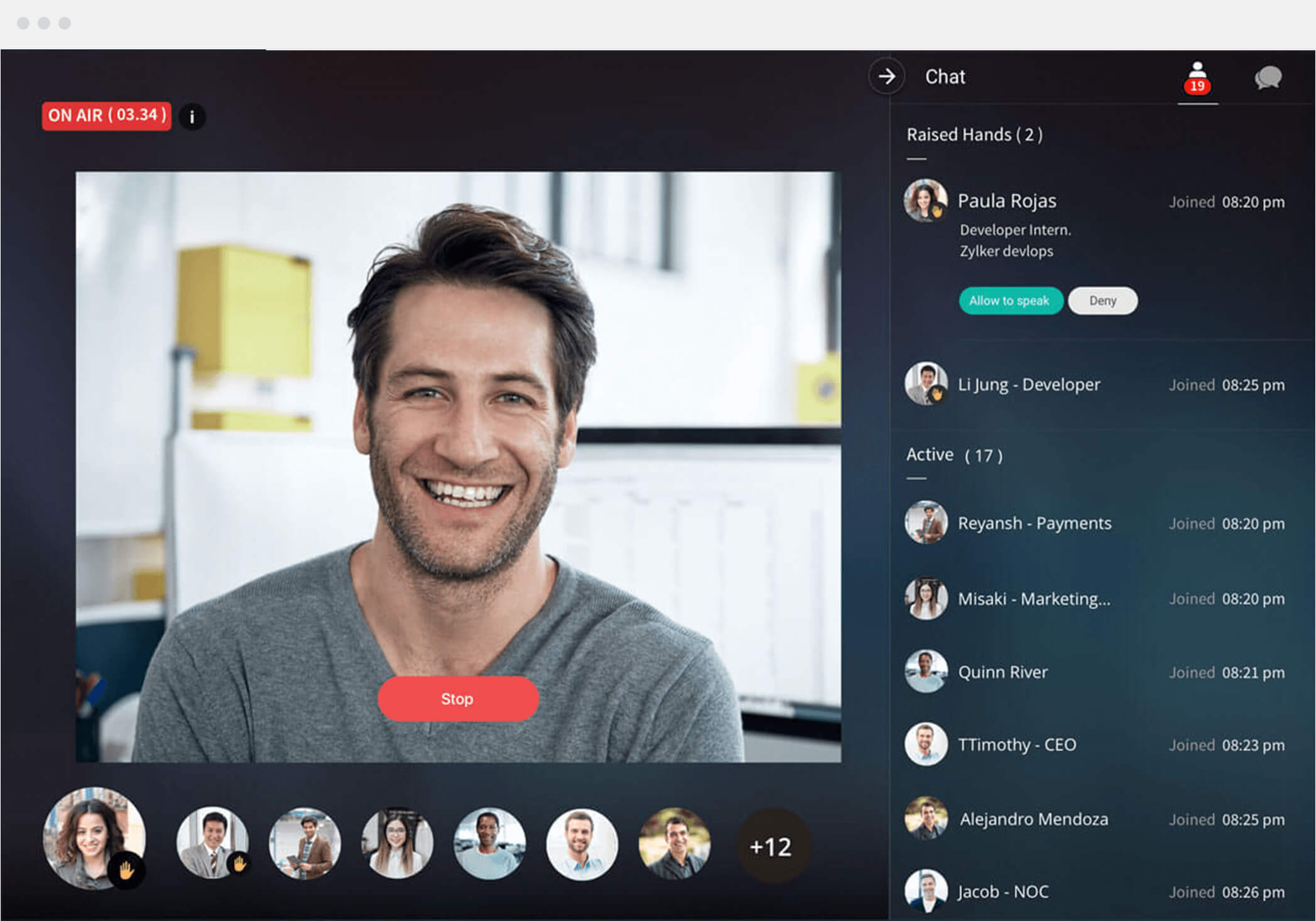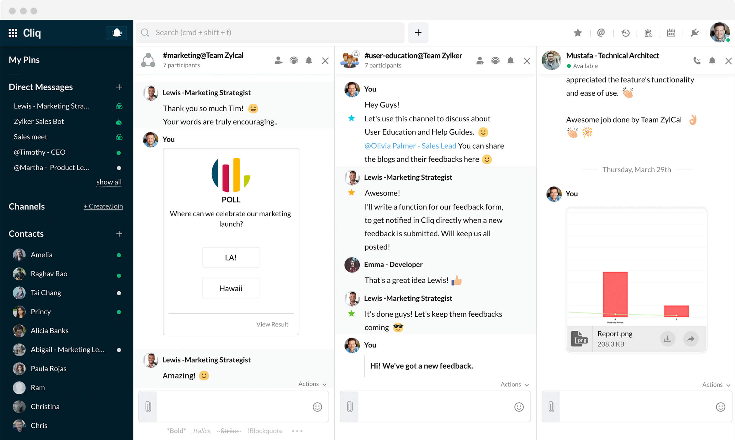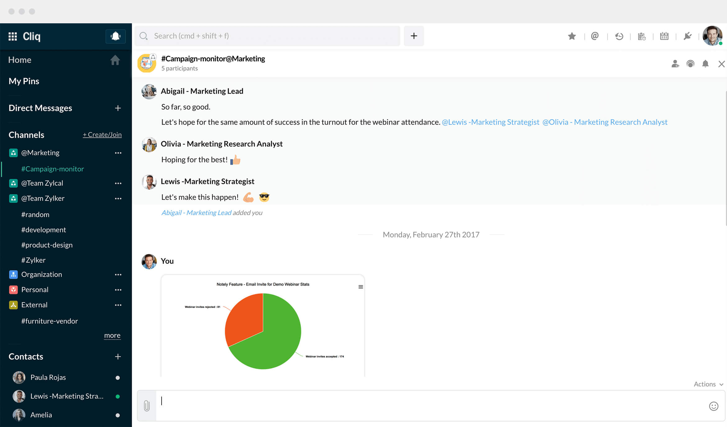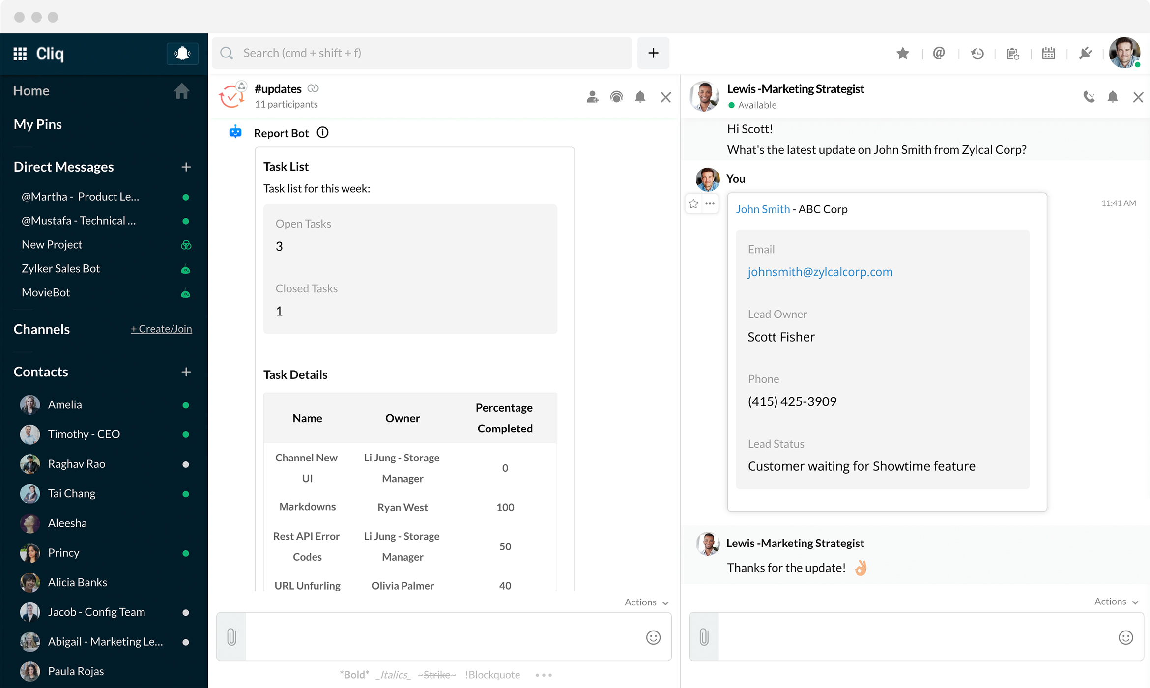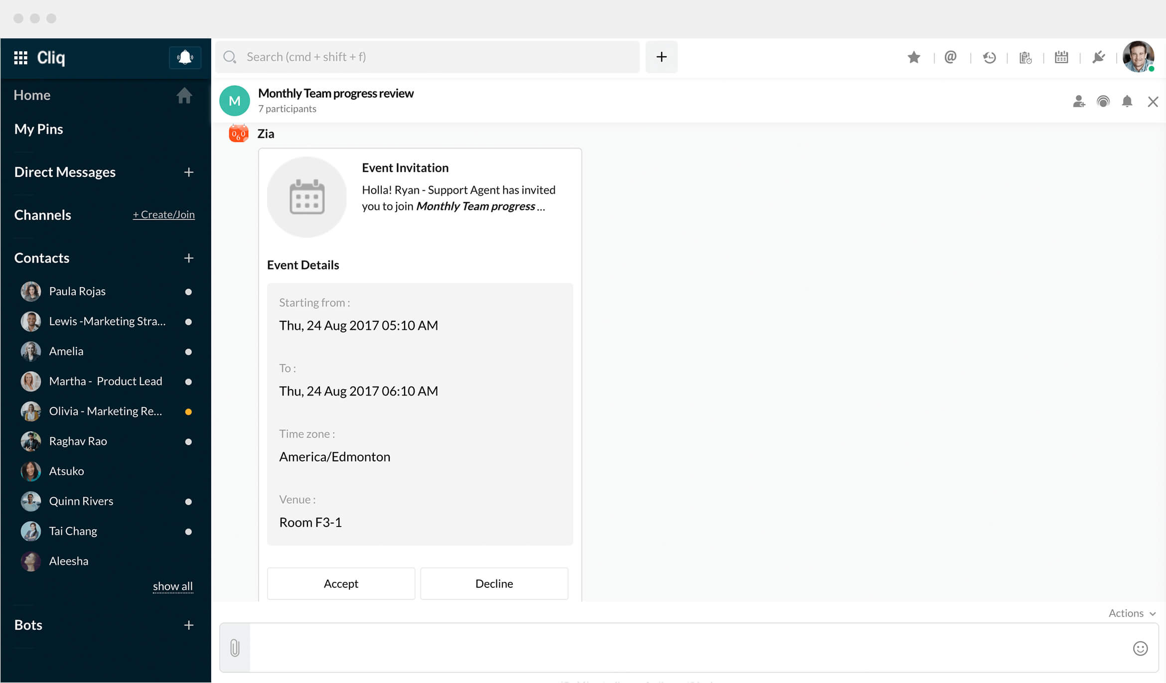 借助 人工智能助手Zia,可从Cliq里安排会议,做出提醒,让团队随时了解最新情况,实现活动规划自动化。