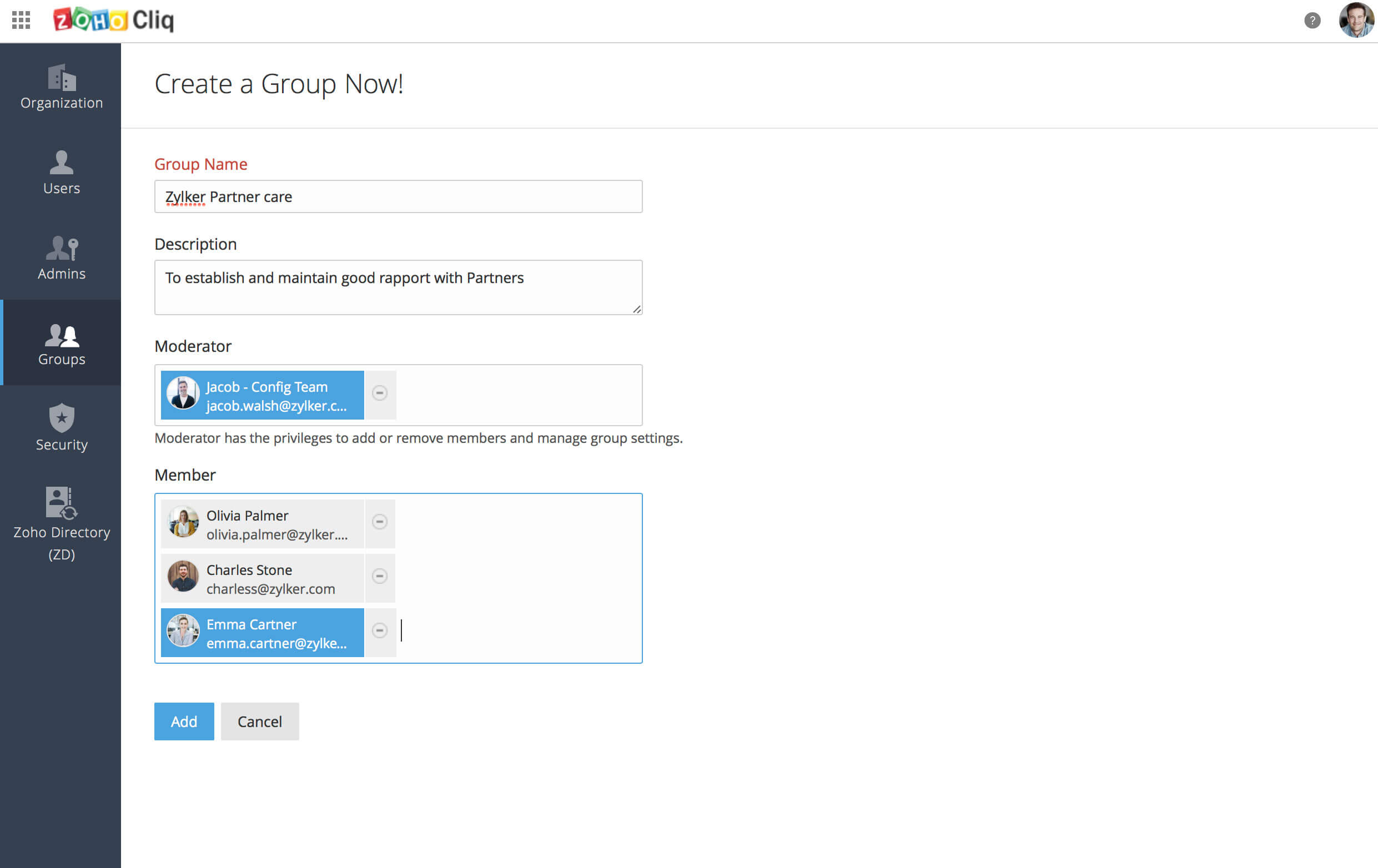 输入群组详细信息,例如群组名称、描述、版主和成员,然后点击“添加”。