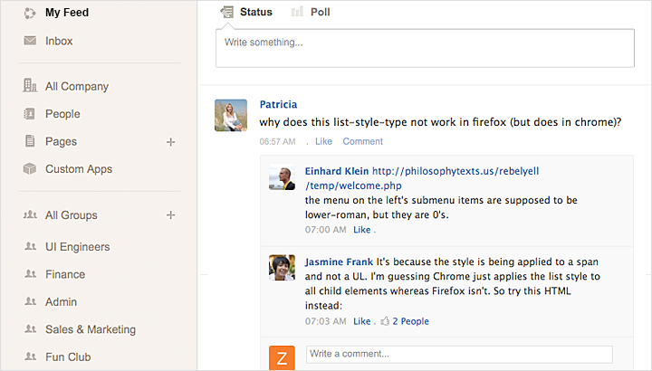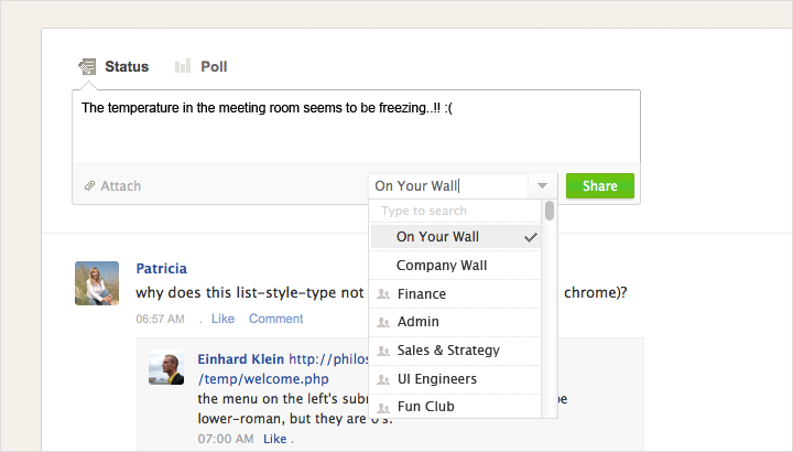 Share any information, project updates or even an inspirational quote for the day and attach files. At a glance get to know what is going on in your organization. Keep track of the people, groups, and projects that matter most to you in one place.