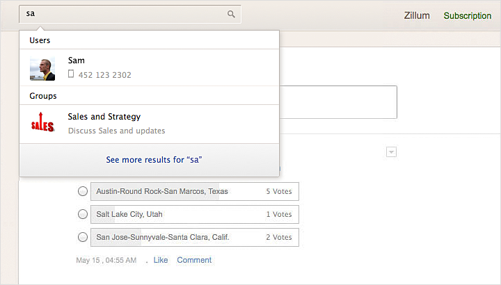 Lets you quickly search for users, streams and groups by keywords. All results are displayed, and appear in context with your search term.
