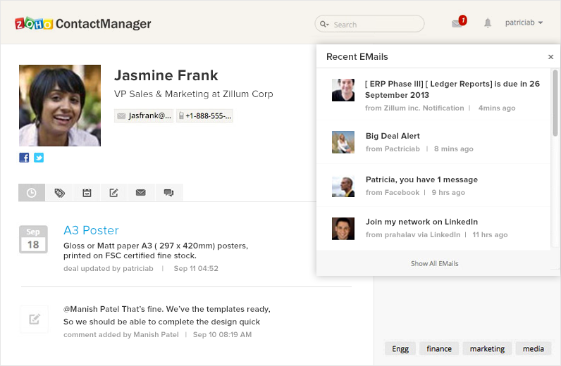 All you need to know about a contact is available in one place. Tasks, meeting notes, history, and all important email conversations with your contact are right inside your contact page. Also, get instant notification when you receive emails from your business contacts without juggling between contacts and Email tab.