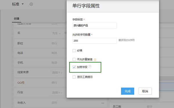数据加密是一种保护您在CRM中存储的信息的方法,只有自定义字段的数据可以被加密。例如:您需要存储诸如信用卡明细、备份电话号码等机密信息,那么您就可以在用户布局中添加这些自定义字段,在创建或编辑这些字段时可以设置数据加密。