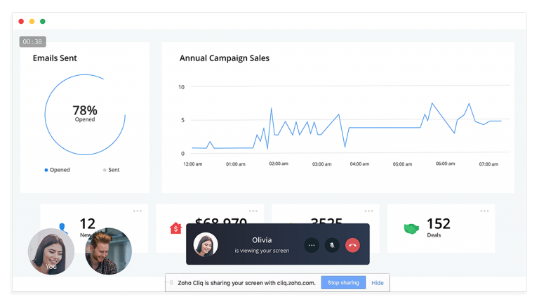 无论同事们分散在何处,都可以通过Zoho Cliq启动屏幕共享,与同事远程会议,顺畅交流。屏幕共享过程中,您可以使用内置音频功能与同事通话,也可以在视频通话和共享屏幕之间流畅切换。